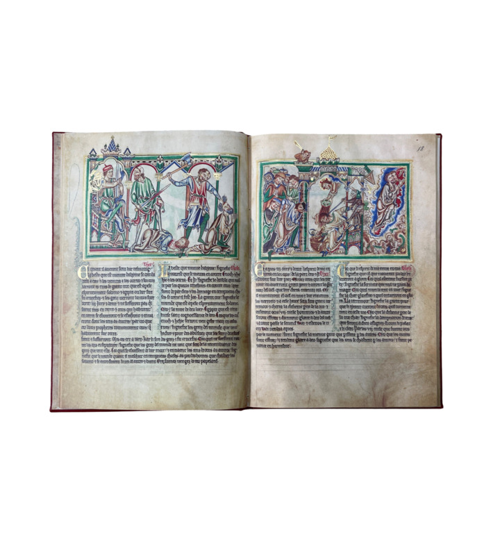 Auf 100 reich verzierten Seiten entfaltet sich ein Zyklus von Miniaturen, die den Text der Offenbarung des Johannes in leuchtenden Farben und mit großzügigem Goldschmuck illustrieren. Jede Szene ist in fein komponierten Registern angelegt, gerahmt von grün-goldenen Ornamentbändern. Die anmutigen, gotisch verfeinerten Figuren kontrastieren mit den dramatischen Visionen der Apokalypse – ein faszinierendes Spannungsverhältnis von Schönheit und Schrecken.