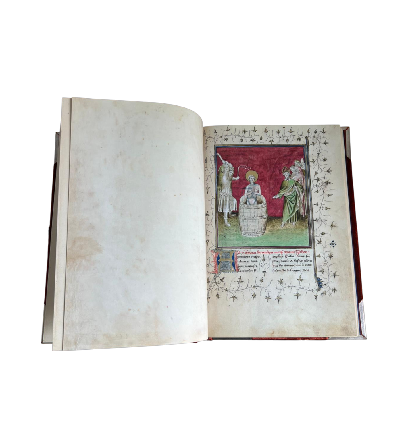 85 halb- und ganzseitige Miniaturen begleiten den Text, meisterlich ausgeführt vom anonymen Meister der Berry-Apokalypse. Sein unverwechselbarer Stil zeichnet sich durch die Konzentration auf das Wesentliche, sparsam eingesetzte, kühle Farben und eine skizzenhafte Eleganz aus, die den Szenen besondere Ausdruckskraft verleiht. Monochrome Hintergründe, dramatische Ikonographie und subtile Goldverzierungen verdichten die apokalyptischen Visionen zu einer einzigartigen Bildsprache.