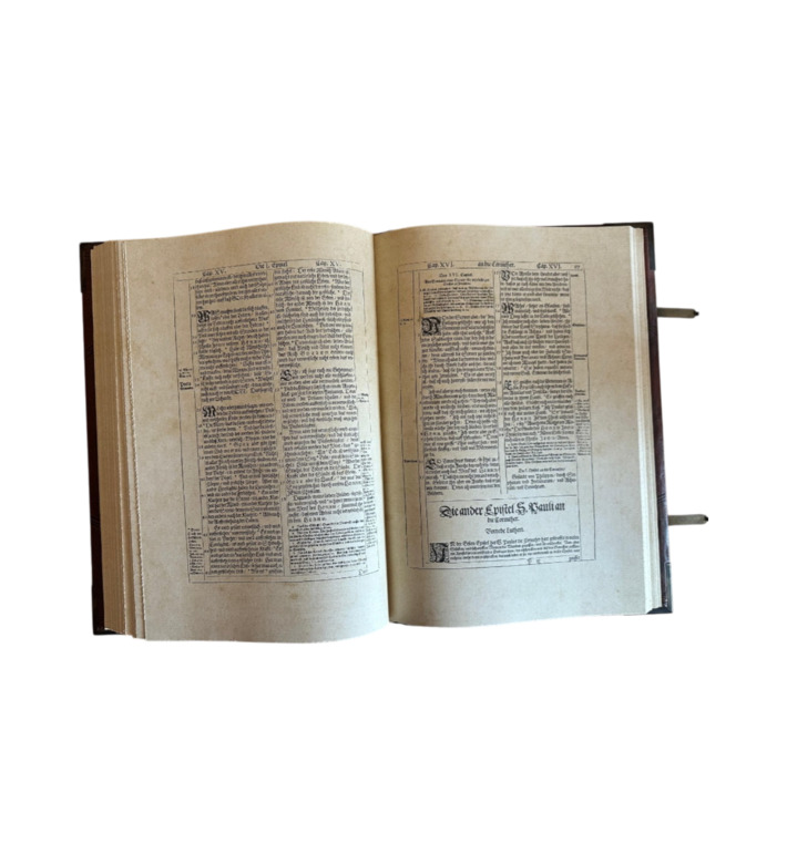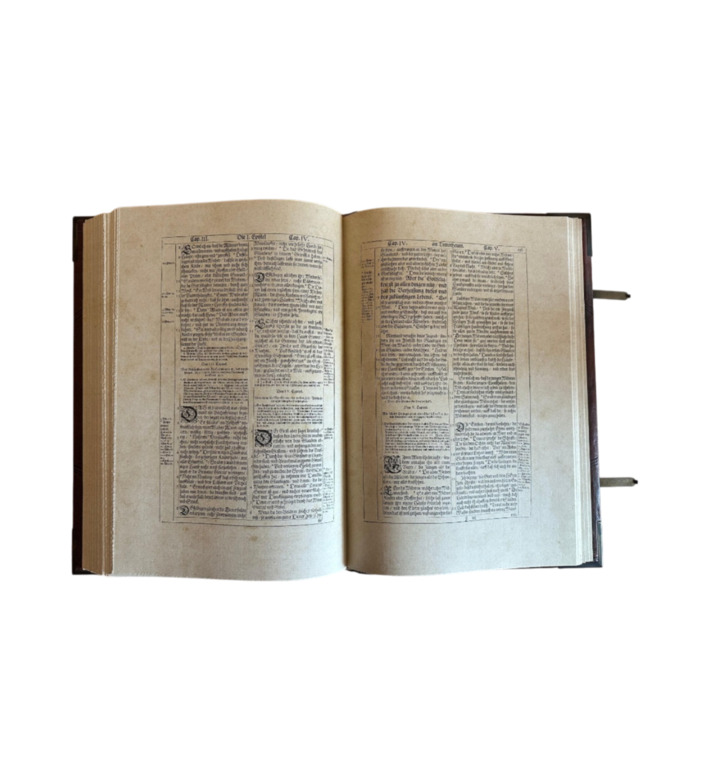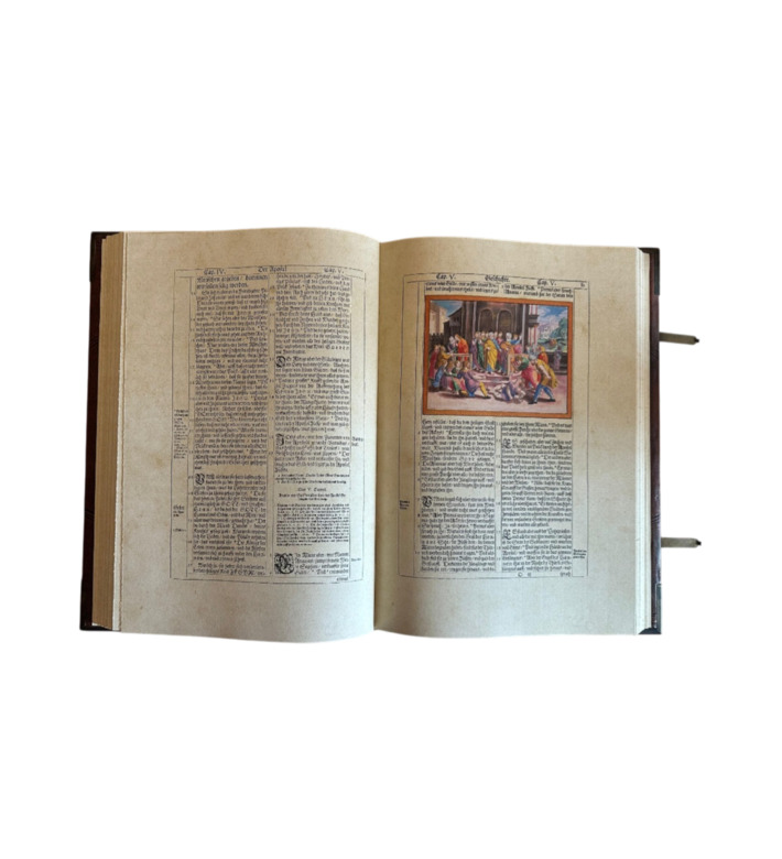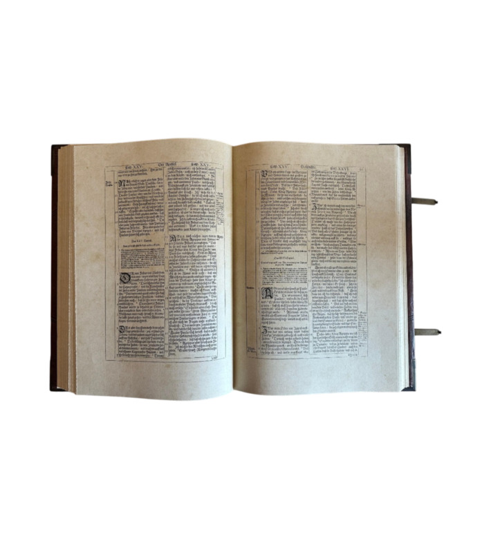 Das prachtvolle Werk erschien bei den Erben des Straßburger Druckers Lazarus Zetzner. Mit Goldschnitt, Lederband, Metallschließen und reicher Prägung ausgestattet, gehört die „Kupferbibel“ zu den begehrtesten Bibelausgaben der Frühen Neuzeit und ist ein Meilenstein barocker Buchkunst.